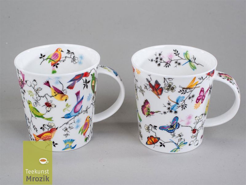 Dunoon Tassen aus Fine Bone China Formtyp Lomond. Die hier angebotenen paradiesischen Becher stammen aus der Serie Paradise. Es sind zwei Motive mit Vögeln oder Schmetterlingen und Libellen erhältlich. Im Innénrand der Porzellantasse ist auch ein entsprechendes Motiv angebracht, ebenso auf dem Henkel.Dieses wunderschöne Geschirr aus Fine Bone China ist leicht und zugleich sehr stabil.